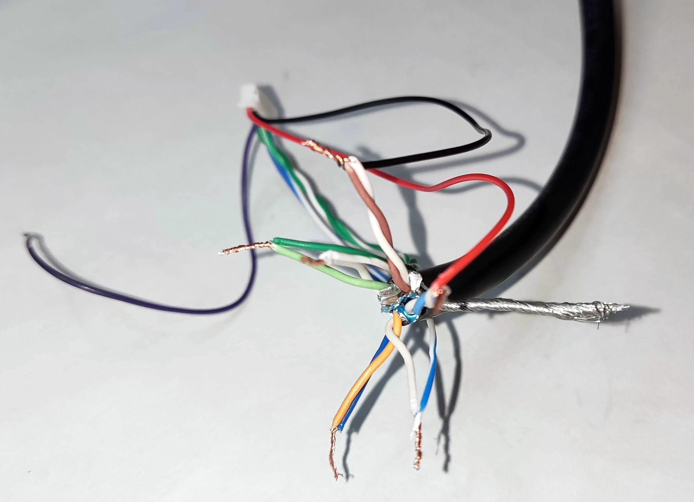 Une fois identifié, on peut connecter les fil du connecteur intérieur de la caméra sur le câble Ethernet qu’on a découpé auparavant. Les photos prise du câble reconnecter ne montre pas que les fil ont été souder ensemble. Mais afin d’avoir un contacte correcte c’est important de le faire. L’isolation des fil a été faite avec du ruban adessif électrique.